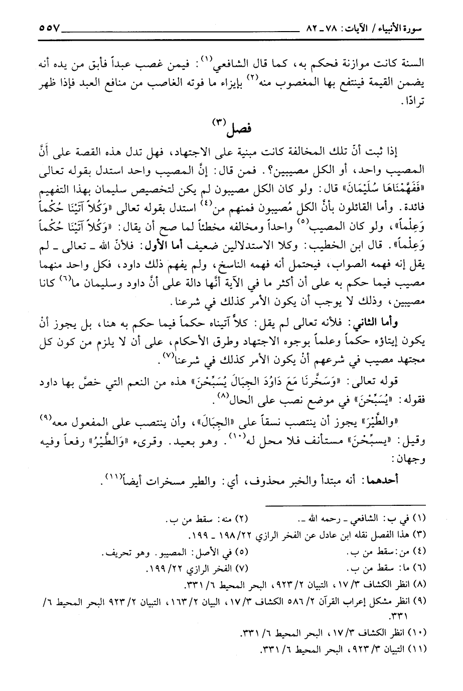 إذا ثبت أنّ تلك المخالفة كانت مبنية على الاجتهاد، فهل تدل هذه القصة على أَنَّ المصيب واحد، أو الكل مصيبين؟ فمن قال: إنَّ المصيب واحد استدل بقوله تعالى {فَفَهَّمْنَاهَا سُلَيْمَانَ} قال: ولو كان الكل مصيبون لم يكن لتخصيص سليمان بهذا التفهيم فائدة. وأما القائلون بأنَّ الكل مصيبون فمنهم من استدل بقوله تعالى {وَكُلاًّ آتَيْنَا حُكْماً وَعِلْماً} ، ولو كان المصيب واحداً ومخالفه مخطئاً لما صح أن يقال: {وَكُلاًّ آتَيْنَا حُكْماً وَعِلْماً} قال ابن الخطيب: وكلا الاستدلالين ضعيف أما الأول: فلأنّ الله - تعالى - لم يقل إنه فهم الصواب، فيحتمل أنه فهممه الناسخ، ولم يفهم ذلك داود، فكان كل واحد منهما مصيب فيما حكم به على أن أكثر ما في الآية أنَّها دالة على أنَّ داود وسليمان ما كانا مصيبين، وذلك لا يوجب أن يكون الأمر كذلك في شرعنا.