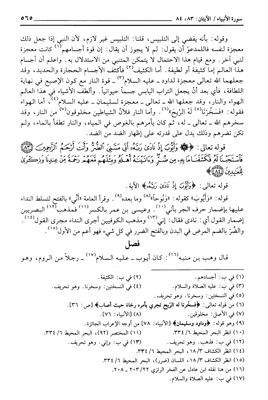 قوله: وَأَيُّوبَ «كقوله:» وَنُوحاً «وما بعده. وقرأ العامة» أَنِّي «بالفتح لتسلط النداء عليها بإضمار حرف الجر بأني. زعيسى بن عمر بالكسر فمذهب البصريين إضمار القول أي: نادى فقال: إني ومذهب الكوفيين أجرى النداء مجرى القول. والضُّرّ بالضم المرض في البدن وبالفتح الضرر في كل شيء فهو أعم من الأول.
