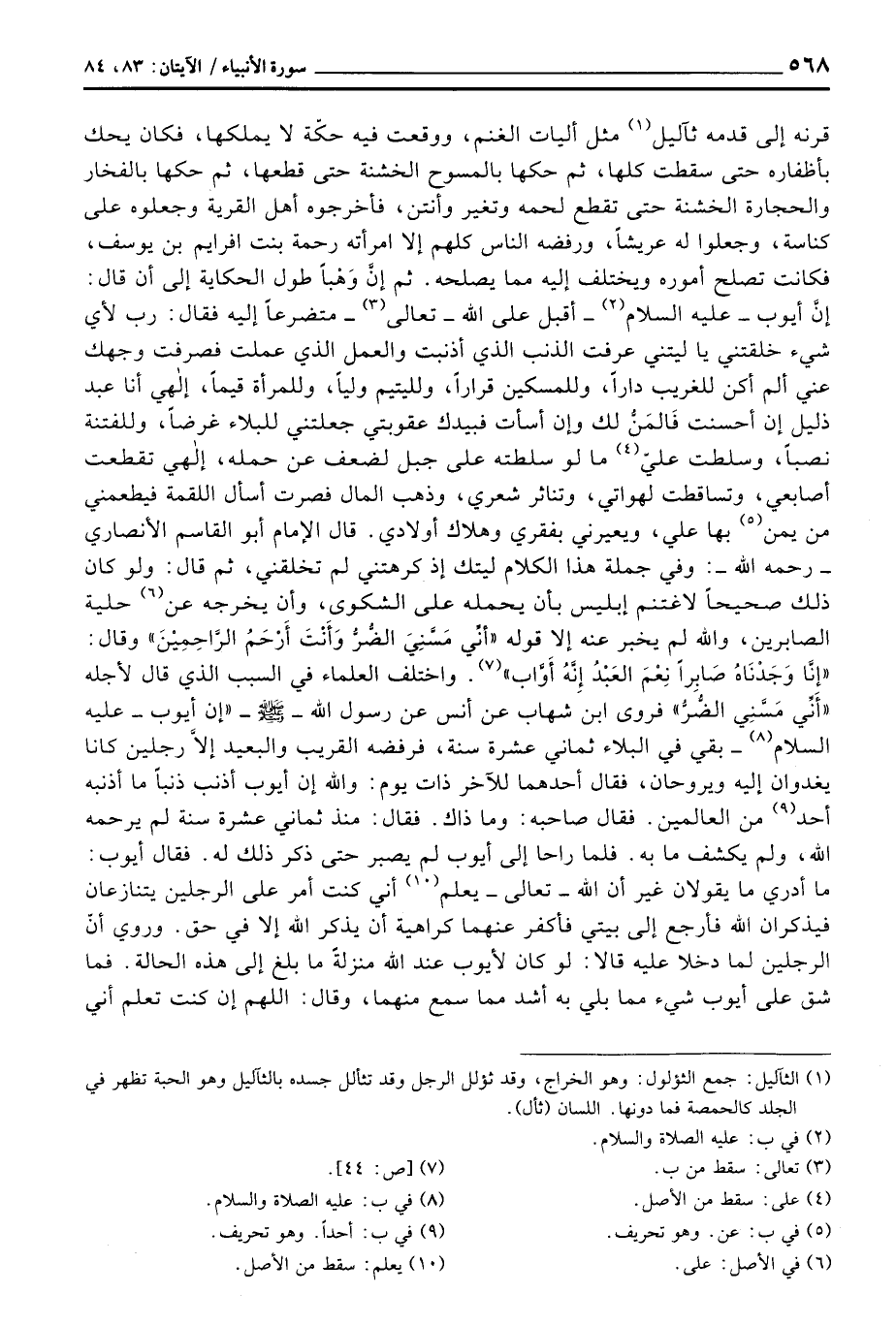 ثم إنَّ وَهْباً طول الحكاية إلى أن قال: إنَّ أيوب - عليه السلام - أقبل على الله - تعالى - متضرعاً إليه فقال: رب لأي شيء خلقتني يا ليتني عرفت الذنب الذي أذنبت والعمل الذي عملت فصرفت وجهك عني ألم أكن للغريب داراً، وللمسكين قراراً، ولليتيم ولياً، وللمرأة قيماً، إلهي أنا عبد ذليل إن أحسنت فَالمَنُّ لك وإن أسأت فبيدك عقوبتي جعلتني للبلاء غرضاً، وللفتنة نصباً، وسلطت عليّ ما لو سلطته على جبل لضعف عن حمله، إلهي تقطعت أصابعي، وتساقطت لهواتي، وتناثر شعري، وذهب المال فصرت أسأل اللقمة فيطعمني من يمن بها علي، ويعيرني بفقري وهلاك أولادي. قال الإمام أبو القاسم الأنصاري - رَحِمَهُ اللَّهُ -: وفي جملة هذا الكلام ليتك إذا كرهتني لم تخلقني، ثم قال: ولو كان ذلك صحيحاً لاغتنم إبليس بان يحمله على الشكوى، وأن يخرجه عن حلية الصابرين، والله لم يخبر عنه إلا قوله {أَنِّي مَسَّنِيَ الضر وَأَنتَ أَرْحَمُ الراحمين} وقال: {إِنَّا وَجَدْنَاهُ صَابِراً نِّعْمَ العبد إِنَّهُ أَوَّابٌ} [ص: 44] . واختلف العلماء في السبب الذي قاله لأجله {أَنِّي مَسَّنِيَ الضر} «فروى ابن شهاب عن أنس عن رسول الله - صَلَّى اللَّهُ عَلَيْهِ وَسَلَّم َ -» إن أيوب - عليه السلام - بقي في البلاء ثماني عشر سنة، فرفضه القريب والبعيد إلاَّ رجلين كانا يغدوان ويروحان، فقال أحدهما للآخر ذات يوم: والله إن أيوب أذنب ذنباً ما أذنبه أحد من العالمين. فقال صاحبه: وما ذاك. فقال: منذ ثماني عشرة سنة لم ي رَحِمَهُ اللَّهُ، ولم يكشف ما به. فلما راحا إلى أيوب لم يصبر حتى ذكر ذلك له. فقال أيوب: ما أدري ما يقولان غير أن الله - تعالى - يعلم أني كنت أمر على الرجلين يتنازعان فيذكران الله فأرجع إلى بيتي فأكفر عنها كراهية أن يذكر الله إلا في حق. وروي أنّ الرجلين لما دخلا عليه قالا: لو كان ليوب عند الله منزلةً ما بلغ في هذه الحالة. فما شق على أيوب شيء مما بلي به أشد مما سمع منهما، وقال: اللهم إن كنت تعلم أني