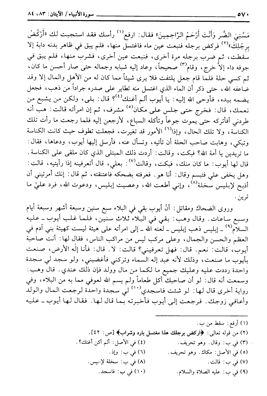 مَسَّنِيَ الضر وَأَنتَ أَرْحَمُ الراحمين} فقال: ارفع رأسك فقد استجبت لك {اركض بِرِجْلِكَ} [ص: 42] فركض برجله فنبعت عين ماء فاغتسل منها، فلم يبق في ظاهر بدنه دابة إلا سقطت، ثم ضرب برجله مرة أخرى، فنبعت عين أخرى، فشرب منها، فلم يبق في جوفه داء إلاَّ خرج، وقام صحيحاً، وعاد إليه شبابه وجماله حتى صار أحسن ما كان، ثم كسي حبة فلما قام جعل يلتفت فلا يرى شيئاً مما كان له من الأهل والمال إلا وقد ضاعفه الله، حتى ذكر أن الماء الذي اغتسل منه تطاير على صدره جراداً من ذهب، فجعل يضمه بيده، فأوحى الله إليه: يا أيوب ألم أغنك؟ قال: بلى، ولكن من يشبع من نعمك، قال: فخرج حتى جلس مكان مشرف، ثم إن امرأته قالت: هب أنه طردني أفأتركه حتى يموت جوعاً وتأكله السباع، لأرجعن غليه فلما رجعت ما رأت تلك الكناسة، ولا تلك الحال، وإذا الأمور قد تغيرت، فجعلت تطوف حيث كانت الكناسة وتبكي، وهابت صاحب الحلة أن تأتيه، وتسأل عنه، فأرسل إيلها أيوب، ودعاها، فقال: ما تريدين يا أمة الله؟ فبكت، وقالت: بعليط، قال أتعرفينه إذا رأتيه، قالت: وهل يخفى علي فتبسم وقال: أنا هو.