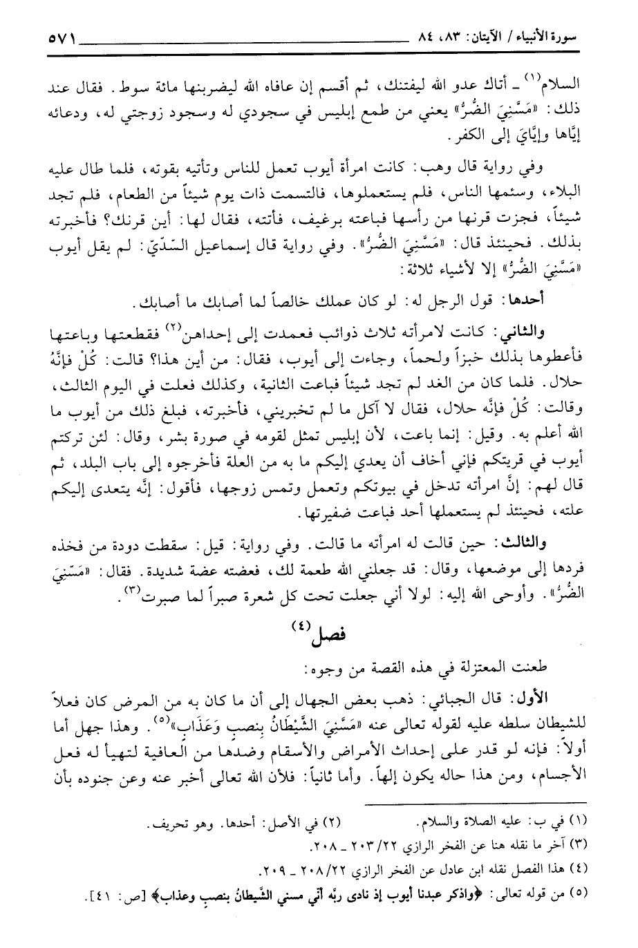 الأول: قال الجبائي: ذهب بعض الجهال إلى أن ما كان به من المرض كان فعلاً للشيطان سلطه عليه لقوله تعالى عنه {مَسَّنِيَ الشيطان بِنُصْبٍ وَعَذَابٍ} [ص: 41] . وهذا جهل أما أولاً: فإنه لو قدر على إحداث الأمراض والأسقام وضدها من العافية لتهيأ له فعل الأجسام، ومن هذا حاله يكون إلهاً. وأما ثانياً: فلأن الله تعالى أخبر عنه وعن جنوده بأن
