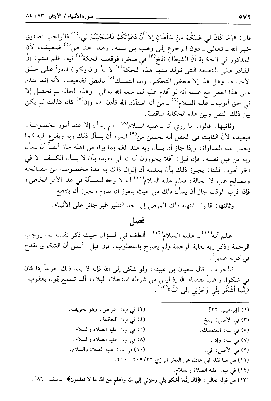 قال: {وَمَا كَانَ لِيَ عَلَيْكُمْ مِّن سُلْطَانٍ إِلاَّ أَن دَعَوْتُكُمْ فاستجبتم لِي} [إبراهيم: 22] فالواجب تصديق خبر الله - تعالى - دون الرجوع إلى وهب بن منبه. وهذا اعتراض ضعيف، لأن المذكور في الحكاية أنَّ الشيطان نفخ في منخره فوقعت الحكة فيه. فلم قلتم: إنَّ القادر على النفخة التي تولد منها هذه الحكة لا بدَّ وأن يكون قادراً على خلق الأجسام، وهذا إلا محض التحكم. وأما التمسك بالنصّ فضعيف، لأنه إنَّما يقدم على الفعل مع علمه أنهل وأقدم عليه لما منعه الله تعالى. وهذه الحالة لم تحصل إلا في حق أيوب - عليه السلام - من أنه استأذن الله فأذن له، وإن كان كذلك لم يكن بين ذلك النص وبين هذه الحكاية مناقضة.
