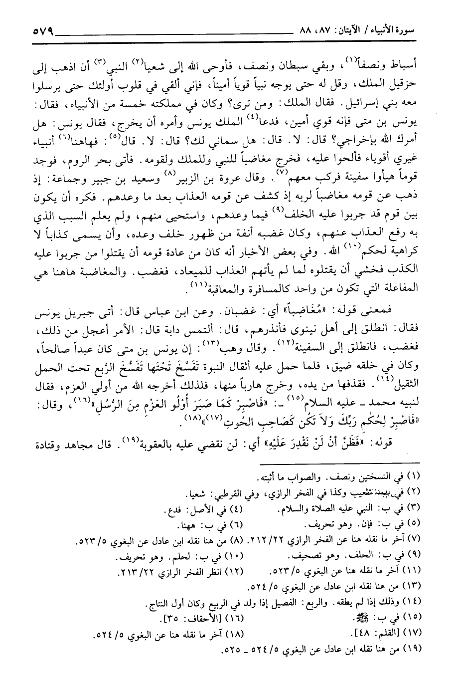 فمعنى قوله: «مُغَاضِباً» أي: غضبان. وعن ابن عباس قال: أتى جبريل يونس فقال: انطلق إلى أهل نينوى فأنذرهم، قال: ألتمس دابة قال: الأمر أعجل من ذلك، فغضب، فانطلق إلى السفينة. وقال وهب: إن يونس بن متى كان عبداً صالحاً، وكان في خلقه ضيق، فلما حمل عليه أثقال النبوة تَفسَّخَ تَحْتَهَا الرَّبع تحت الحمل الثقيل. فقذفها من يده، وخرج هارباً منها، فلذلك أخرجه الله من أول العزم، فقال لنبيه محمد - عليه السلام -: {فاصبر كَمَا صَبَرَ أُوْلُواْ العزم مِنَ الرسل} [الأحقاف: 35] ، قال: {فاصبر لِحُكْمِ رَبِّكَ وَلاَ تَكُن كَصَاحِبِ الحوت} [القلم: 48] .