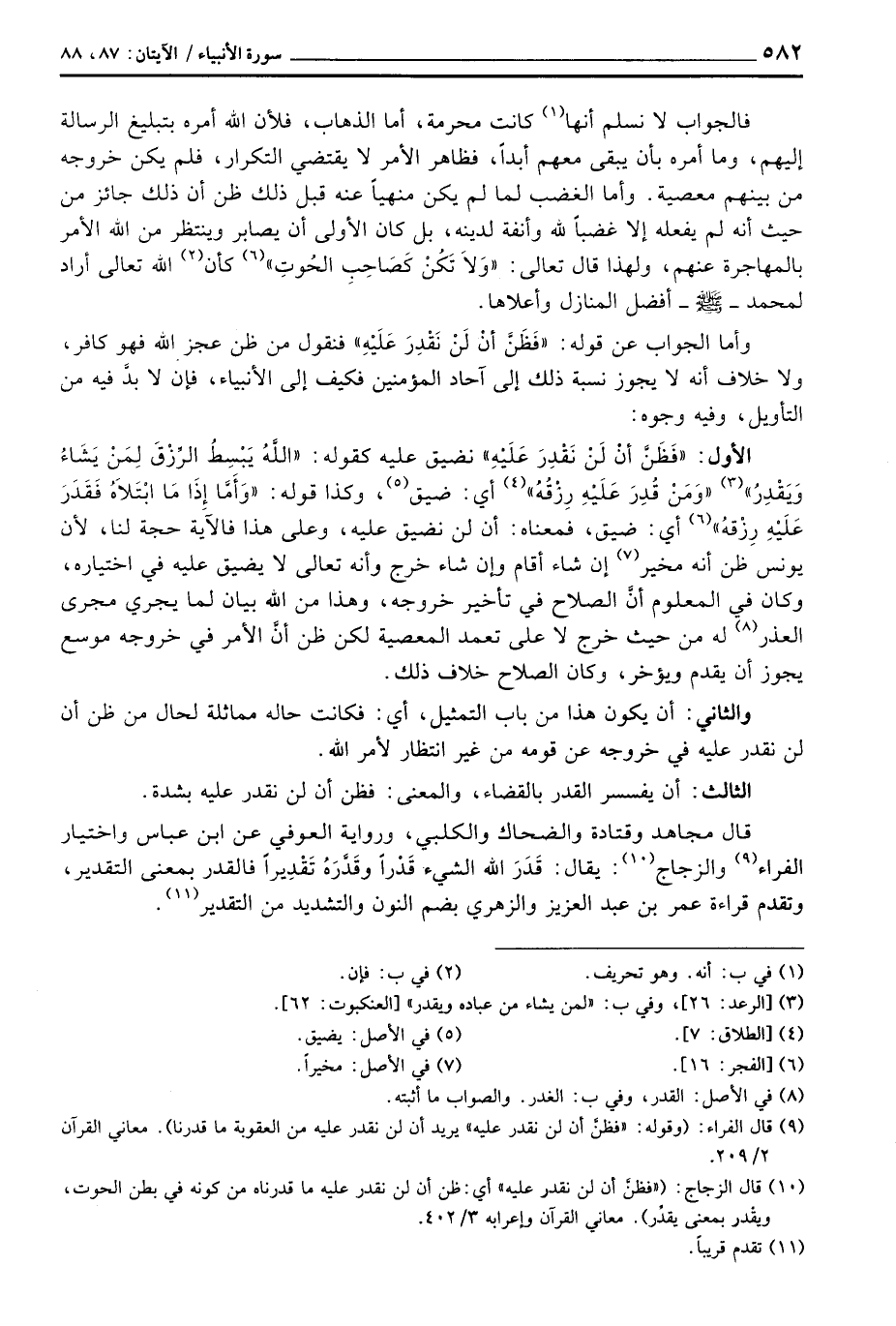 {الله يَبْسُطُ الرزق لِمَنْ يَشَآءُ وَيَقَدِرُ} [الرعد: 26] {وَمَن قُدِرَ عَلَيْهِ رِزْقُهُ} [الطلاق: 7] أي: ضيق، وكذا قوله: {وَأَمَّآ إِذَا مَا ابتلاه فَقَدَرَ عَلَيْهِ رِزْقَهُ} [الفجر: 16] أي: ضيق، فمعناه: أن لن نضيق عليه، وهلى هذا فالآية حجة لنا، لأن يونس ظن أنه مخير إن شاء أقام وإن شاء خرج وأنه تعالى لا يضيق عليه في اختياره، وكان في المعلوم أنَّ الصلاح في تأخير خروجه، وهذا من الله بيان لما يجري مجرى العذر له من حيث خرج لا على تعمد المعصية لكن ظن أنَّ الأمر في خروجه موسع يجوز أن يقدم ويؤخر، وكان الصلاح خلاف ذلك.