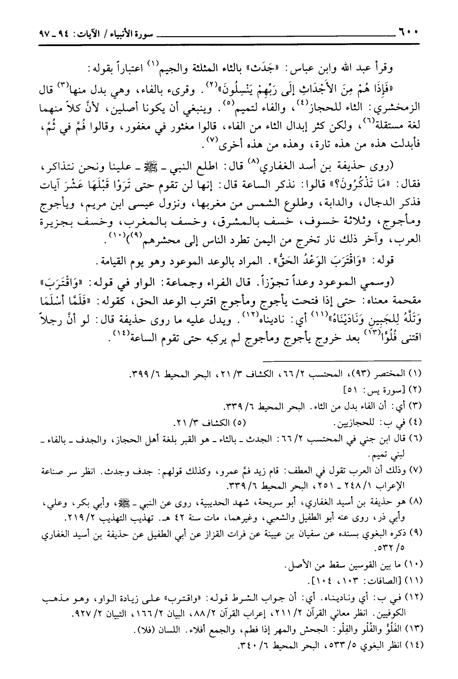 (وسمي الموعود وعداً تجوّزا. قال الفراء وجماعة: الواو في قوله: «وَاقْتَرَبَ» مقحمة معناه: حتى إذا فتحت يأجوج ومأجوج اقترب الوعد الحق، كقوله: {فَلَمَّا أَسْلَمَا وَتَلَّهُ لِلْجَبِينِ وَنَادَيْنَاهُ} [الصافات: 103، 104] أي: ناديناه. ويدل عليه ما روى حذيفة قال: لو أنَّ رجلاً اقتنى فُلُّوا بعد خروج يأجوج ومأجوج لم يركبه حتى تقوم الساعة.
