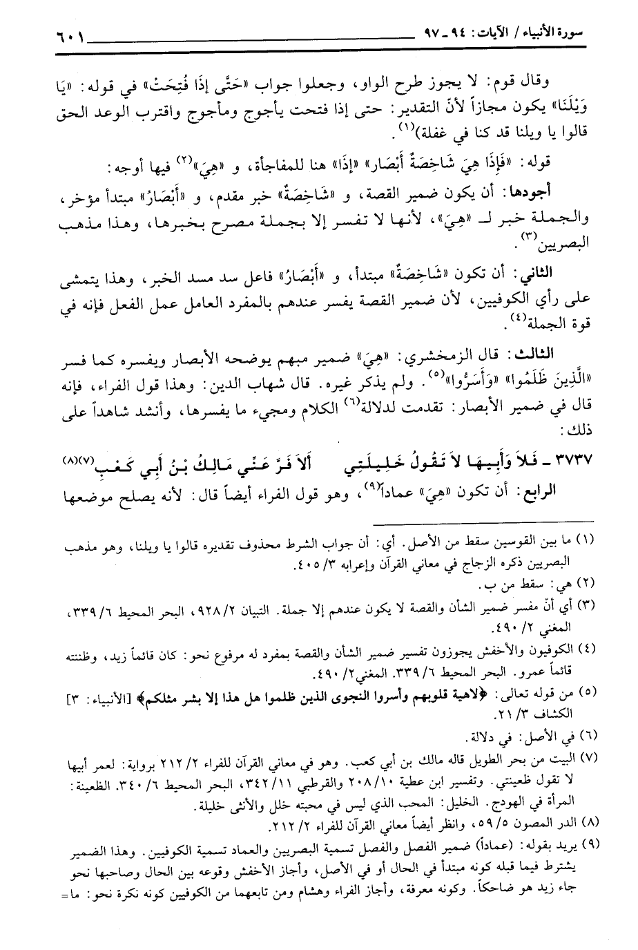 أجودها: أن يكون ضمير القصة، و «شَاخِصَةٌ» خبر مقدم، و «أَبْصَارُ» مبتدأ مؤخر، والجملة خبر ل «هِيَ» ، لأنها لا تفسر إى بجملة مصرح بخبرها، وهذا مذهب البصريين.