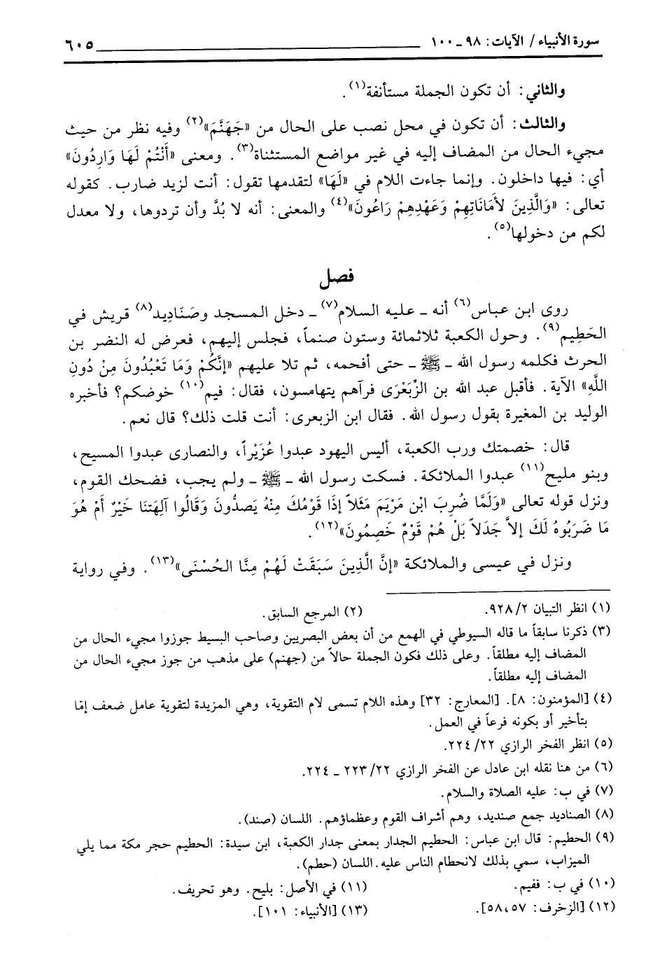 » روى ابن عباس أنه - عليه السلام - دخل المسجد وصَنَادِيد قريش في الحَطِيم. وحول الكعبة ثلاثمائة وستون صنماً، فجلس إليهم، فعرض له النضر بن الحرث فكلمه رسول الله صَلَّى اللَّهُ عَلَيْهِ وَسَلَّم َ - حتى أفحمه، ثم تلا عليهم {إِنَّكُمْ وَمَا تَعْبُدُونَ مِن دُونِ الله} الآية. فأقبل عبد الله بن الزَّبَعْرَى فرآهم يتهامسون، فقال: فيم خوضكم؟ فأخبره الوليد بن المغيرة بقول رسول الله. فقال ابن الزبعرى: انت قلت ذلك؟ قال نعم.