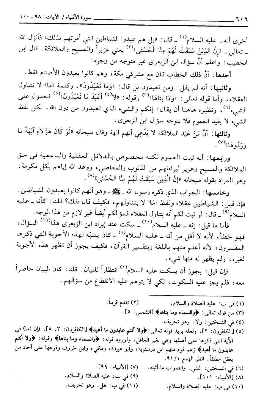 فإما ما قيل: إنه - عليه السلام - سكت عن إيراد ابن الزبعرى هذا السؤال، فهو خطأ، لأنه لا أقل من أنه - عليه السلام - كان يتنبّه لهذه الأجوبة التي ذكرها المفسرون، لأنه أعلم منهم باللغة وبتفسير القرآن، فكيف يجوز أن تظهر هذه الأجوبة لغيره، ولم يظهر له منها شيء.