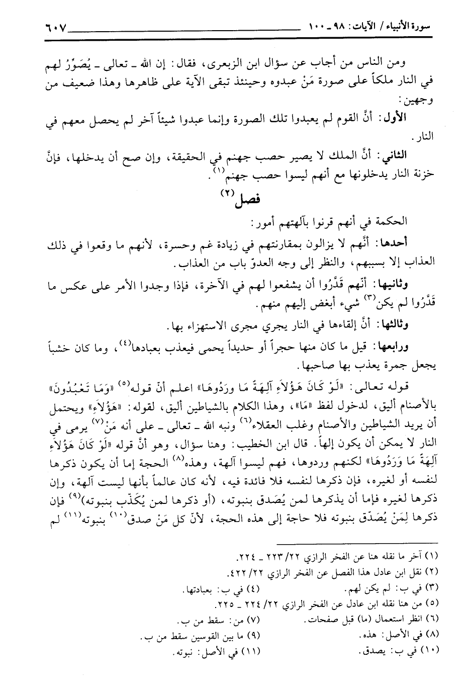 ومن الناس من أجاب عن سؤال ابن الزبعرى، فقال: إن الله - تعالى - يُصَوِّر لهم في النار ملكاً على صورة مَنْ عبدوه وحينئذ تبقى الآية على ظاهرها وهذا ضعيف من وجهين: