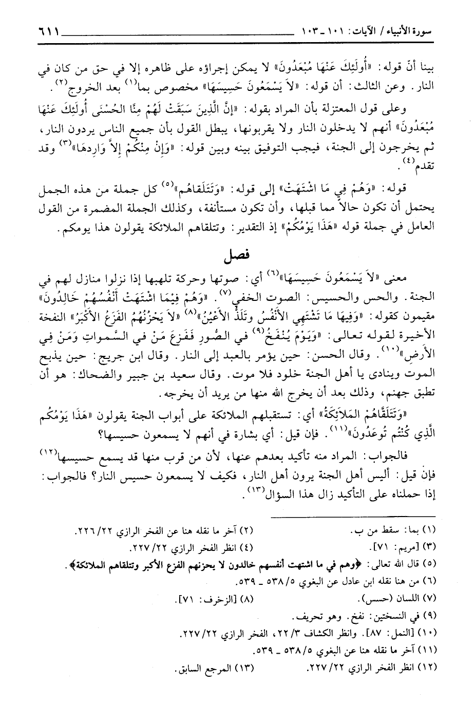 فالجواب: المراد منه تأكيد بعدهم عنها، لأن من قرب منها قد يسمع حسيسها فإن قيل: أليس أهل الجنة يرون أهل النار، فكيف لا يسمعون حسيس النار؟ فالجواب: إذا حملناه على التأكيد زال هذا السؤال.