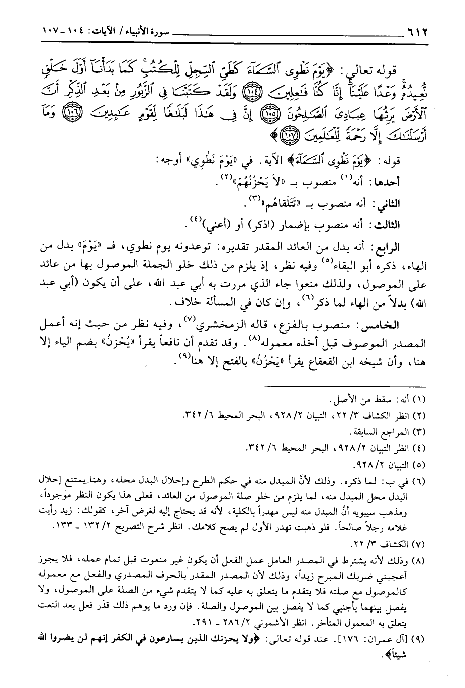 الرابع: أنه بدل من العائد المقدر تقديره: توعدونه يوم نطوي، ف «يَوْمَ» بدل من الهاء، ذكره أبو البقاء وفيه نظر، إذ يلزم من ذلك خلو الجملة الموصول بها من عائد على الموصول، ولذلك منعوا جاء الذي مررت به أبي عبد الله، على أن يكون (أبي عبد الله) بدلاً من الهاء لما ذكر، وإن كان في المسألة خلاف.