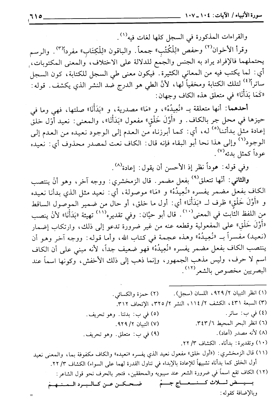 وقرأ الأخوان وحفص «لِلْكُتُبِ» جمعاً. والباقون «لِلْكِتَابِ» مفرداً. والرسم يحتملهما فالإفراد يراد به الجنس والجمع للدلالة على الاختلاف، والمعنى المكتوبات، أي: لما يكتب فيه من المعاني الكثيرة. فيكون معنى طي السجل للكتابة، كون السجل ساتراً لتلك الكتابة ومخفياً لها، لأنّ الطي هو الدرج ضد النشر الذي يكشف. قوله: «كَمَا بَدَأْنَا» في متعلق هذه الكاف وجهان: