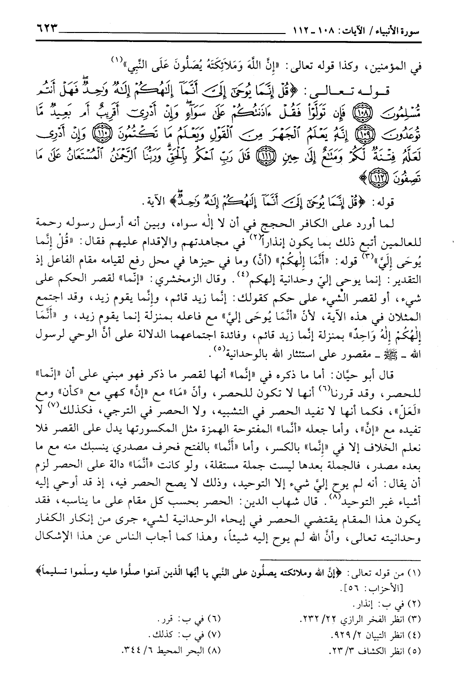 قال أبو حيَّان: أما ما ذكره في «إنَّما» أنها لقصر ما ذكر فهو مبني على أن «إنّما» للحصر، وقد قررنا أنها لا تكون للحصر، وأنّ «مَا» مع «إنَّ» كهي مع «كأن» ومع «لَعَلّ» فكما أنها لا تفيد الحصر في التشبيه، ولا الحصر في الترجي، فكذلك لا تفيده مع «إنَّ» ، وأما جعله «أنَّما» المفتوحة الهمزة مثل المكسورتها يدل على القصر فلا نعلم الخلاف إلا في «إنَّما» بالكسر، وأما «أنَّما» بالفتح فحرف مصدري ينسبك منه مع ما بعده مصدر، فالجملة بعدخا ليست جملة مستقلة، ولو كانت «أنَّمَا» دالى على الحصر لزم أن يقال: أنه لم يوح إليَّ شيء إلا التوحيد، وذلك لا يصح الحصر فيه، إذ قد أوحي إليه أشياء غير التوحيد. قال شهاب الدين: الحصر بحسب كل مقام على ما يناسبه، فقد يكون هذا المقام بقتضي الحصر في إيحاء الوحدانية لشيء جرى من إنكار الكفار وحدانيته تعالى، وأنَّ الله لم يوح إليه شيئاً، وهذا كما أجاب الناس عن هذا الإشكال