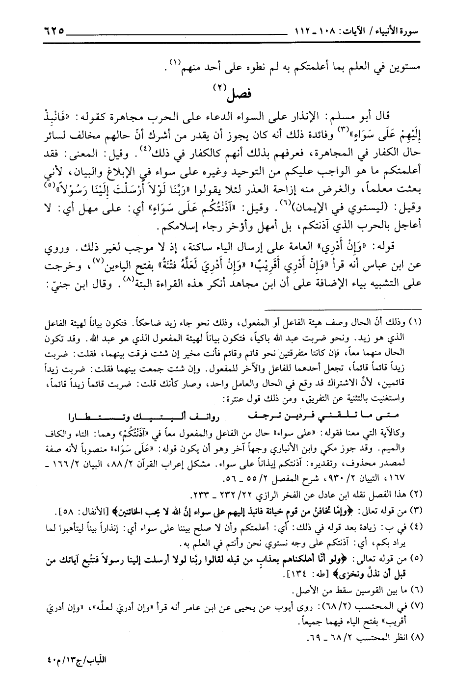قال أبو مسلم: الإنذار على السواء الدعاء على الحرب مجاهرة كقوله: {فانبذ إِلَيْهِمْ على سَوَآءٍ} [الأنفال: 58] وفائدة ذلك أنه كان يجوز أن يقدر من أشرك أنّ ةحالهم مخالف لسائر حال الكفار في المجاهرة، فعرفهم بذلك أنهم كالكفار في ذلك. وقيل: المعنى: فقد أعلمتكم ما هو الواجب عليكم من التوحيد وغيره على سواء في الإبلاغ والبيان، لأني بعثت معلماً، والغرض منه إزاحة العذر لئلا يقولوا {رَبَّنَا لولاا أَرْسَلْتَ إِلَيْنَا رَسُولاً} [طه: 134] وقيل: (ليستوي في الإيمان) . وقيل: {آذَنتُكُمْ على سَوَآءٍ} أي: على مهل أي: لا أعاجل بالحرب الذي آذنتكم، بل أمهل وأؤخر رجاء إسلامكم.