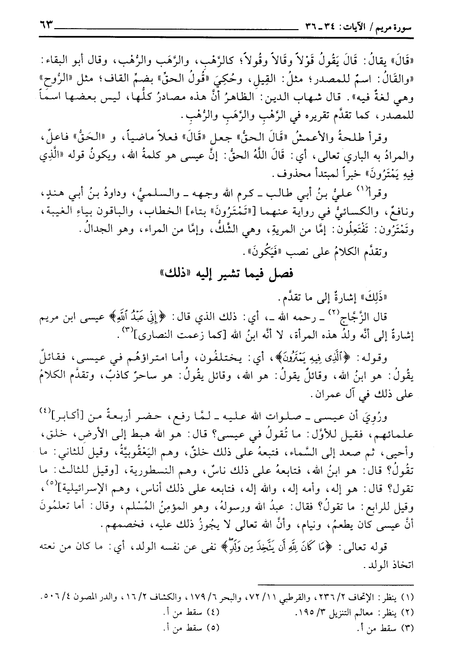 قال الزَّجَّّاج - رَحِمَهُ اللَّهُ -، أي: ذلك الذي قال: {إِنِّي عَبْدُ الله} [مريم: 30] عيسى ابن مريم إشارةٌ إلى أنَّه ولدُ هذه المرأة، لا أنَّه ابنُ الله [كما زعمت النصارى] .
