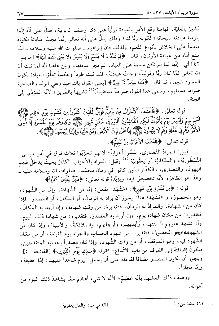 قوله: {مِن مَّشْهِدِ يَوْمٍ عَظِيمٍ} : «مَشْهَد» مفعل: إمَّا من الشَّهادة، وإمَّا من الشُّهود، وهو الحضورُ، و «مَشْهَدا» هنا: يجوز أن يراد به الزمانُ، أو المكان، أو المصدر: فإذا كان من الشهادة، والمرادُ به الزمانُ، فتقديرهُ: من وقتٍ شهادة، وإن أريد به المكانُ، فتقديره: من مكانِ شهادةِ يومٍ، وإن أريد المصدرُ، فتقديره: من شهادة ذلك اليومِ، وأن تشهد عليهم ألسنتهم، وأيديهم، وأرجلهم، والملائكة ُ، والأنبياءُ، وإذا كان من الشهود فيه، وهو الموقفُ، أو من وقت الشُّهود، وإذا كان مصدراً بحاليته المتقدمتين، فتكونُ إضافتهُ إلى الظرف من باب الاتِّساع؛ كقوله {مالك يَوْمِ الدين} [الفاتحة: 4] .
