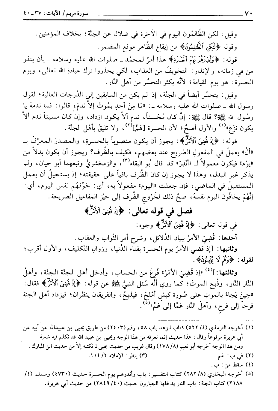 وثالثها:] «إذْ قُضِيَ الأمْرُ» فُرِغَ من الحساب، وأدخل أهل الجنَّة الجنَّة، وأهلُ النَّار النَّار، وذُبح الموتُ؛ كما روي أنَّه سُئل النبيُّ صَلَّى اللَّهُ عَلَيْهِ وَسَلَّم َ عن قوله: {إِذْ قُضِيَ الأمر} فقال: «حِينَ يَجاءُ بالموتِ على صُورة كبشٍ أمْلَحَ، فيذبحُ، والفريقان ينظران؛ فيزداد أهل الجنة فرحاً إلى فرحٍ، وأهلُ النَّار غمَّا إلى غمِّ» .