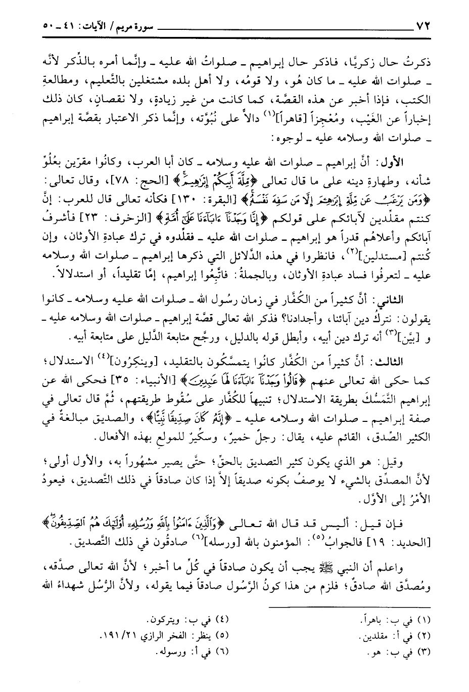 الأول: أنَّ إبراهيم - صلوات الله عليه وسلامه - كان أبا العرب، وكانُوا مقرّين بعُلُوِّ شانه، وطهارةِ دينه على ما قال تعالى {مِّلَّةَ أَبِيكُمْ إِبْرَاهِيمَ} [الحج: 78] ، وقال تعالى: {وَمَن يَرْغَبُ عَن مِّلَّةِ إِبْرَاهِيمَ إِلاَّ مَن سَفِهَ نَفْسَهُ} [البقرة: 130] فكأنه تعالى قال للعرب: إنَّ كنتم مقلِّدين لآبائكم على قولكم {إِنَّا وَجَدْنَآ آبَآءَنَا على أُمَّةٍ} [الزخرف: 23] فأشرفُ آبائكم وأعلاهُم قدراً هو إبراهيم - صلوات الله عليه - فقلِّدوه في ترك عبادةِ الأوثان، وإن كُنتم [مستدلين] ، فانظروا في هذه الدَّلائل التي ذكرها إبراهيم - صلوات الله وسلامه عليه - لتعرفُوا فساد عبادةِ الأوثان، وبالجملةُ: فاتَّبِعُوا إبراهيم، إمَّا تقليداً، أو استدلالاً.
