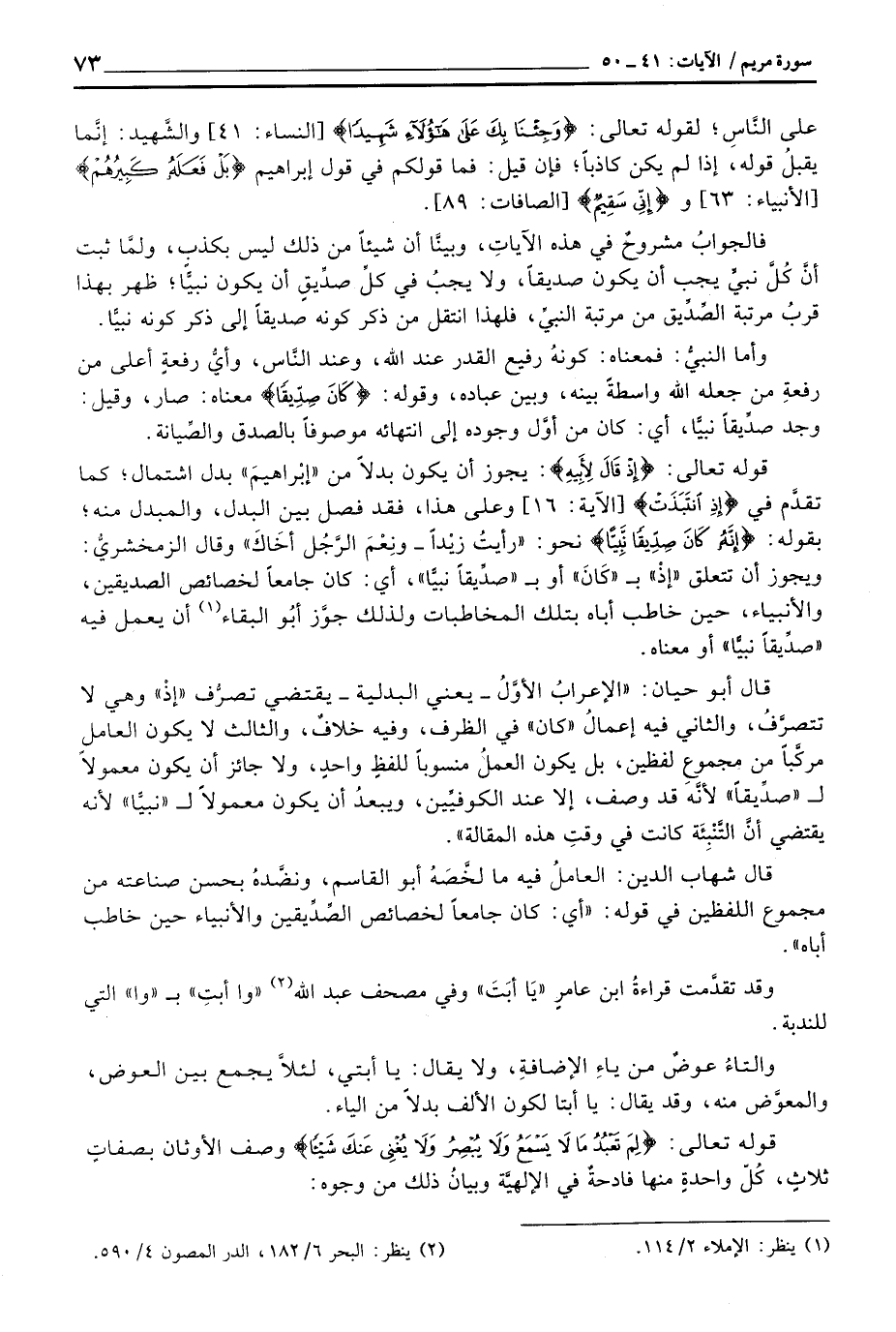 قوله تعالى: {إِذْ قَالَ لاًّبِيهِ} : يجوز أن يكون بدلاً من «إبْراهيمَ» بدل اشتمال؛ كما تقدَّم في {إِذِ انتبذت} [الآية: 16] وعلى هذا، فقد فصل بين البدل، والمبدل منه؛ بقوله: {إِنَّهُ كَانَ صِدِّيقاً نَّبِيّاً} نحو: «رأيتُ زيْداً - ونِعْمَ الرَّجُل أخَاكَ» وقال الزمخشريُّ: ويجوز أن تتعلق «إذْ» ب «كَانَ» أو ب «صدِّيقاً نبيًّا» ، أي: كان جامعاً لخصائص الصديقين، والأنبياء، حين خاطب أباه بتلك المخاطبات ولذلك جوَّز أبُو البقاء أن يعمل فيه «صدِّيقاً نبيًّا» أو معناه.