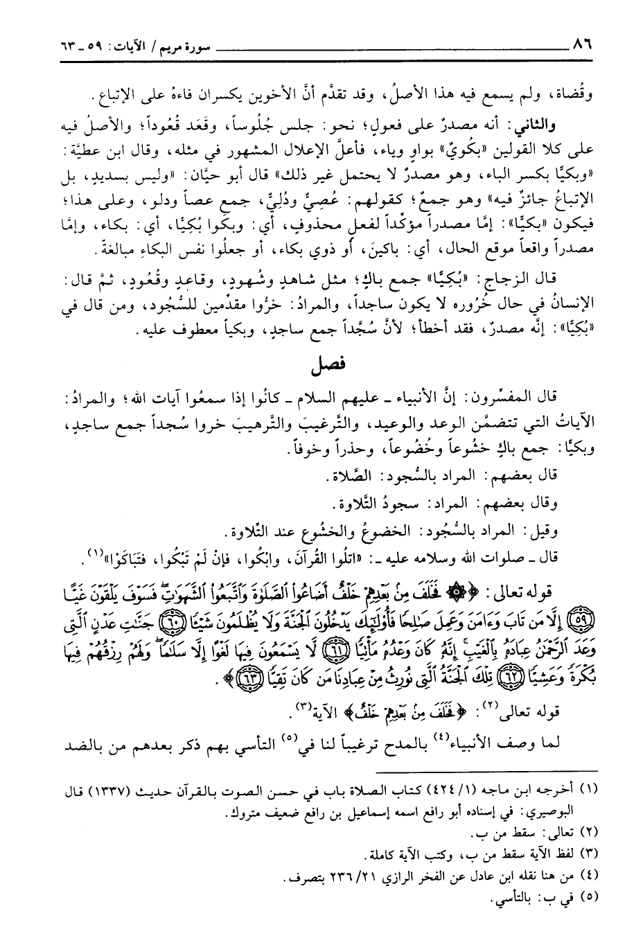 قال المفسِّرون: إنَّ الأنبياء - عليهم السلام - كانُوا إذا سمعُوا آيات الله؛ والمرادُ: الآياتُ التي تتضمنُ الوعد والوعيد، والتَّرغيبَ والتَّرهيب خروا سُجداً جمع ساجدٍ، وبكيًّا: جمع باكٍ خشُوعاً وخُضُوعاً، وحذراً وخوفاً.