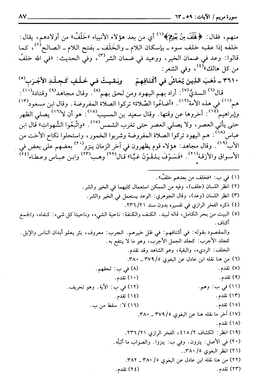 قال السديُّ: أراد بهم اليهود ومن لحق بهم. وقال مجاهد وقتادة: هم في هذه الأمة. «أضاعُوا الصَّلاة» تركوا الصلاة المفروضة. وقال ابن مسعود وإبراهيم: أخروها عن وقتها. وقال سعيد بن المسيب: هو أن لا يصلي الظهر حتى يأتي العصر، ولا يصلي العصر حتى تغرب الشمس. «واتَّبعُوا الشَّهواتِ» قال ابن عباس: هم اليهود تركوا الصلاة وشربوا الخمور، واستحلوا نكاح الأخت من الأب. وقال مجاهد: هؤلاء قوم يظهرون في آخر الزمان ينزو بعضهم على بعض في الأسواق والأزقة. «فَسَوْفَ يقَوْنَ غيًّا» قال وهب وابن عباس وعطاء