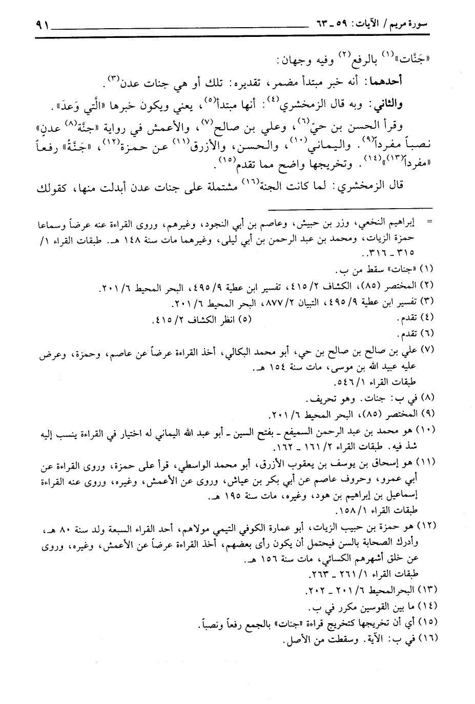 وقرأ الحسن بن حيّ، وعلي بن صالح، والأعمش في رواية «جنَّة عدنٍ» نصباً مفرداً. واليماني، والحسن، والأزرق عن حمزة، «جَنَّةُ» رفعاً «مفرداً» . وتخريجها واضح مما تقدم.