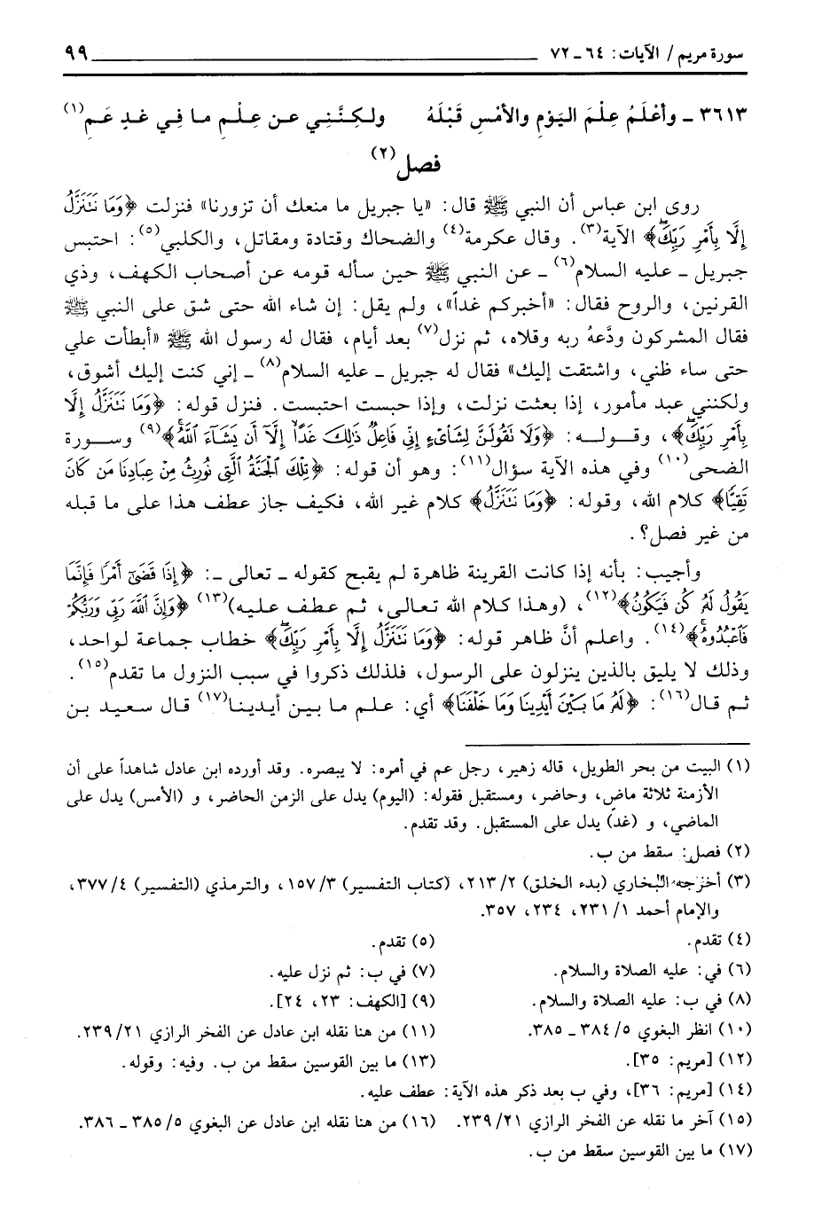 فنزل قوله: {وَمَا نَتَنَزَّلُ إِلاَّ بِأَمْرِ رَبِّكَ} ، وقوله: {وَلاَ تَقْولَنَّ لِشَيْءٍ إِنِّي فَاعِلٌ ذلك غَداً إِلاَّ أَن يَشَآءَ} [الكهف: 23، 24] وسورة الضحى وفي هذه الآية سؤال: وهو أن قوله: {تِلْكَ الجنة التي نُورِثُ مِنْ عِبَادِنَا مَن كَانَ تَقِيّاً} [مريم: 63] كلام الله، وقوله: {وَمَا نَتَنَزَّلُ} كلام غير الله، فكيف جاز هذا على ما قبله من غير فصل؟ .