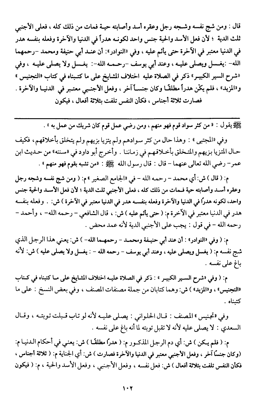 قال: ومن شج نفسه وشجه رجل وعقره أسد وأصابته حية فمات من ذلك كله، فعلى الأجنبي ثلث الدية؛ لأن فعل الأسد والحية جنس واحد لكونه هدرا في الدنيا والآخرة، وفعله بنفسه هدر في الدنيا معتبر في الآخرة حتى يأثم عليه، وفي " النوادر ": أن عند أبي حنيفة ومحمد - رحمهما الله -: يغسل ويصلى عليه، وعند أبي يوسف - رَحِمَهُ اللَّهُ -: يغسل ولا يصلى عليه، وفي " شرح السير الكبير " ذكر في الصلاة عليه اختلاف المشايخ على ما كتبناه في كتاب " التجنيس " و " المزيد "، فلم يكن هدرا مطلقا وكان جنسا آخر، وفعل الأجنبي معتبر في الدنيا والآخرة. فصارت ثلاثة أجناس، فكأن النفس تلفت بثلاثة أفعال، فيكون