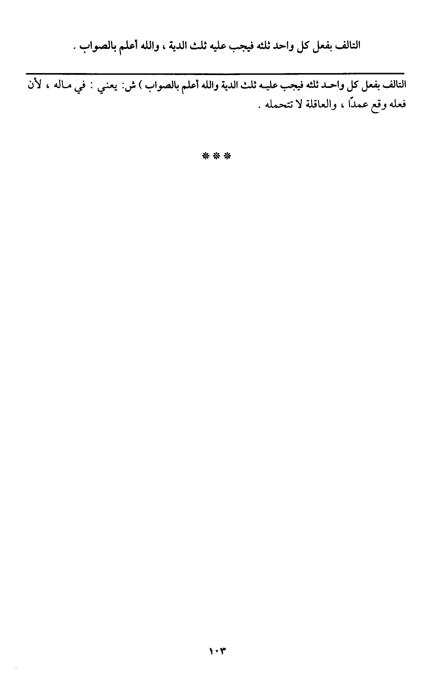 ـــــــــــــــــــــــــــــQالتالف بفعل كل واحد ثلثه فيجب عليه ثلث الدية والله أعلم بالصواب) ش: يعني: في ماله؛ لأن فعله وقع عمدا، والعاقلة لا تتحمله.