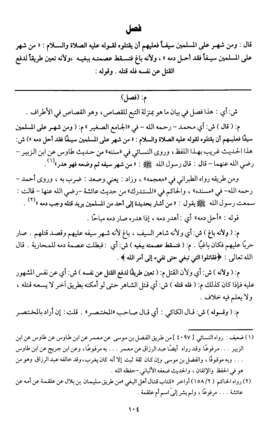 فصل قال: ومن شهر على المسلمين سيفا فعليهم أن يقتلوه لقوله - عَلَيْهِ الصَّلَاةُ وَالسَّلَامُ -: «من شهر على المسلمين سيفا فقد أحل دمه» ، ولأنه باغ فتسقط عصمته ببغيه، ولأنه تعين طريقا لدفع القتل عن نفسه فله قتله. وقوله: