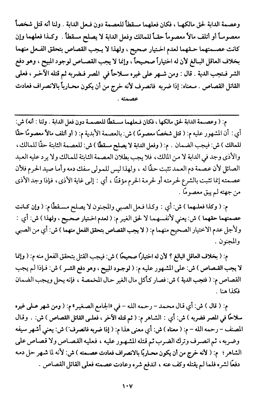 وعصمة الدابة لحق مالكها، فكان فعلهما مسقطا للعصمة دون فعل الدابة. ولنا أنه قتل شخصا معصوما أو أتلف مالا معصوما حقا للمالك وفعل الدابة لا يصلح مسقطا. وكذا فعلهما وإن كانت عصمتهما حقهما لعدم اختيار صحيح، ولهذا لا يجب القصاص بتحقق الفعل منهما بخلاف العاقل البالغ لأن له اختيارا صحيحا، وإنما لا يجب القصاص لوجود المبيح، وهو دفع الشر فتجب الدية. قال: ومن شهر على غيره سلاحا في المصر فضربه، ثم قتله الآخر، فعلى القاتل القصاص. معناه: إذا ضربه فانصرف لأنه خرج من أن يكون محاربا بالانصراف فعادت عصمته.