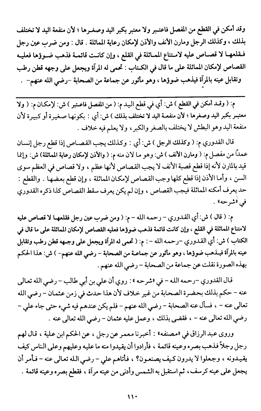وروى عبد الرزاق في "مصنفه ": أخبرنا معمر عن رجل، عن الحكم ابن علية، قال لهم رجل رجلًا فذهب بصره وعينه قائمة، فأرادوا أن يقيدوا منه ما عليه وعليهم وعلى الناس كيف يقيدونه، وجعلوا لا يدرون كيف يصنعون، فأتاهم علي - رَضِيَ اللَّهُ تَعَالَى عَنْهُ - فأمر أن يجعل على عينه كرسف، ثم استقبل به الشمس وأدنى من عينه مرآة، فقطع بصره وعينه قائمة.