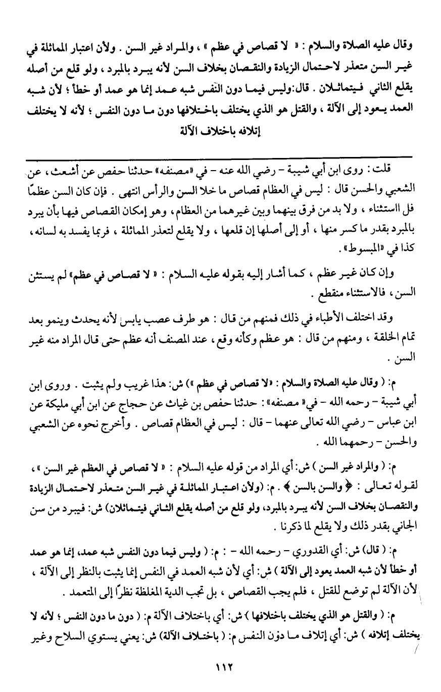 ـــــــــــــــــــــــــــــQقلت: روى ابن أبي شيبة - رَضِيَ اللَّهُ عَنْهُ - في "مصنفه " حدثنا حفص عن أشعث عن الشعبي والحسن قال: ليس في العظام قصاص ما خلا السن والرأس انتهى. فإن كان السن عظما فلا استثناء، ولا بد من فرق بينهما وبين غيرهما من العظام. وهو إمكان القصاص فيها بأن يبرد بالمبرد بقدر ما كسر منها، أو إلى أصلها إن قلعها، ولا يقلع لتعذر المماثلة، فربما يفسد به لسانه، كذا في " المبسوط ".