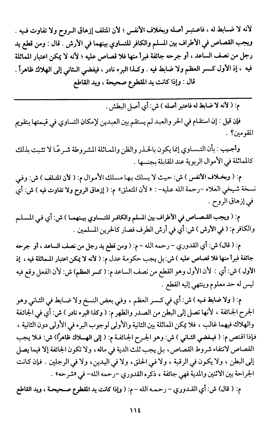 قال: ومن قطع يد رجل من نصف الساعد، أو جرحه جائفة فبرأ منها فلا قصاص عليه؛ لأنه لا يمكن اعتبار المماثلة فيه، إذ الأول كسر العظم ولا ضابط فيه. وكذا البرء نادر، فيفضي الثاني إلى الهلاك ظاهرا. قال: وإذا كانت يد المقطوع صحيحة، ويد القاطع