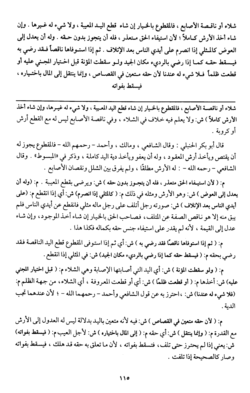 قال أبو بكر الحنبلي: وقال الشافعي، ومالك، وأحمد - رَحِمَهُمُ اللَّهُ - فالمقطوع يجوز له أن يقتص ويأخذ أرش المعقود، وله أن يعفو ويأخذ دية اليد كاملة، وذكر في " المبسوط ". وقال الشافعي - رَحِمَهُ اللَّهُ -: له الأرش مطلقا، ولم يفرق بين الشلل ونقصان الأصابع.
