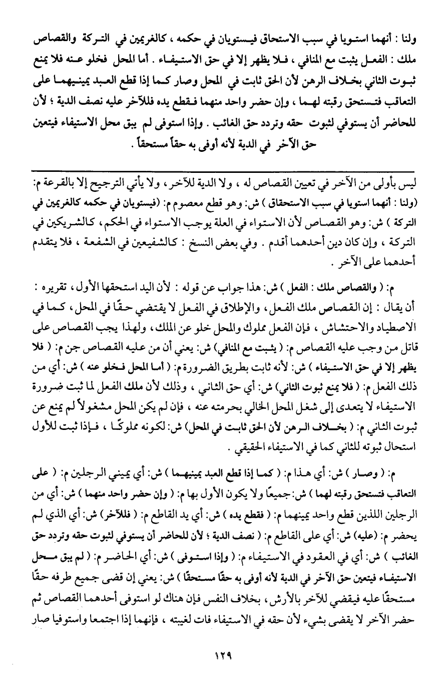 ولنا: أنهما استويا في سبب الاستحاق فيستويان في حكمه، كالغريمين في التركة والقصاص ملك: الفعل يثبت مع المنافي، فلا يظهر إلا في حق الاستيفاء. أما المحل فخلو عنه فلا يمنع ثبوت الثاني بخلاف الرهن؛ لأن الحق ثابت في المحل وصار كما إذا قطع العبد يمينيهما على التعاقب فتستحق رقبته لهما، وإن حضر واحد منهما فقطع يده فللآخر عليه نصف الدية؛ لأن للحاضر أن يستوفي لثبوت حقه وتردد حق الغائب. وإذا استوفى لم يبق محل الاستيفاء فيتعين حق الآخر في الدية؛ لأنه أوفى به حقا مستحقا.