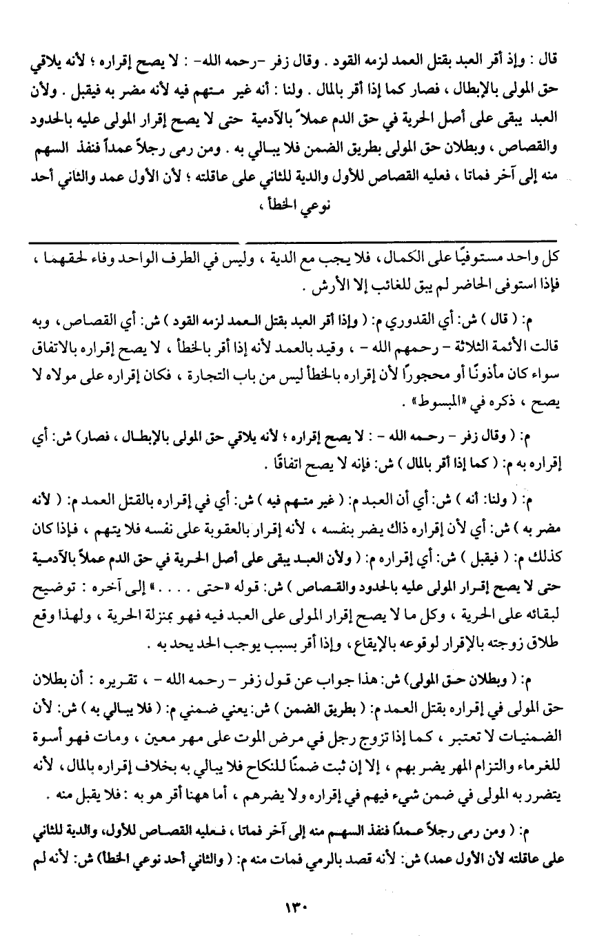 قال: وإذ أقر العبد بقتل العمد لزمه القود. وقال زفر - رَحِمَهُ اللَّهُ -: لا يصح إقراره؛ لأنه يلاقي حق المولى بالإبطال، فصار كما إذا أقر بالمال. ولنا: أنه غير متهم فيه لأنه مضر به فيقبل. ولأن العبد يبقى على أصل الحرية في حق الدم عملا بالآدمية حتى لا يصح إقرار المولى عليه بالحدود والقصاص، وبطلان حق المولى بطريق الضمن فلا يبالي به. ومن رمى رجلا عمدا فنفذ السهم منه إلى آخر فماتا، فعليه القصاص للأول والدية للثاني على عاقلته؛ لأن الأول عمد والثاني أحد نوعي الخطأ.
