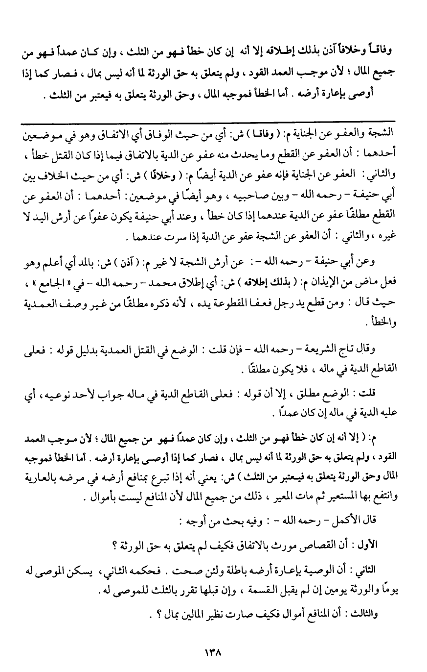 م: (إلا أنه إن كان خطأ فهو من الثلث، وإن كان عمدا فهو من جميع المال؛ لأن موجب العمد القود، ولم يتعلق به حق الورثة لما أنه ليس بمال، فصار كما إذا أوصى بإعارة أرضه. أما الخطأ فموجبه المال وحق الورثة يتعلق به فيعتبر من الثلث) ش: يعني أنه إذا تبرع بمنافع أرضه في مرضه بالعارية وانتفع بها المستعير ثم مات المعير، ذلك من جميع المال لأن المنافع ليست بأموال.