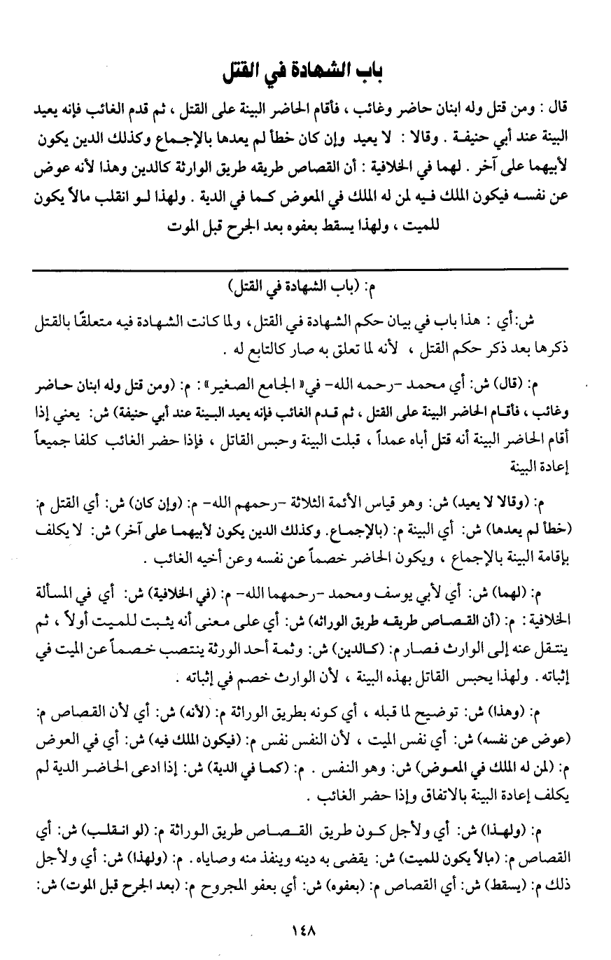 باب الشهادة في القتل قال: ومن قتل وله ابنان حاضر وغائب، فأقام الحاضر البينة على القتل، ثم قدم الغائب فإنه يعيد البينة عند أبي حنيفة. وقالا: لا يعيد وإن كان خطأ لم يعدها بالإجماع وكذلك الدين يكون لأبيهما على آخر. لهما في الخلافية: أن القصاص طريقه طريق الوارثة كالدين وهذا لأنه عوض عن نفسه فيكون الملك فيه لمن له الملك في المعوض كما في الدية. ولهذا لو انقلب مالا يكون للميت، ولهذا يسقط بعفوه بعد الجرح قبل الموت
