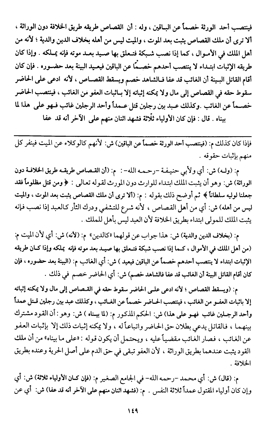 فينتصب أحد الورثة خصما عن الباقين، وله: أن القصاص طريقه طريق الخلافة دون الوراثة، ألا ترى أن ملك القصاص يثبت بعد الموت، والميت ليس من أهله بخلاف الدين والدية: لأنه من أهل الملك في الأموال، كما إذا نصب شبكة فتعلق بها صيد بعد موته فإنه يملكه. وإذا كان طريقه الإثبات ابتداء لا ينتصب أحدهم خصما عن الباقين فيعيد البينة بعد حضوره. فإن كان أقام القاتل البينة أن الغائب قد عفا فالشاهد خصم ويسقط القصاص، لأنه ادعى على الحاضر سقوط حقه في القصاص إلى مال ولا يمكنه إثباته إلا بإثبات العفو من الغائب، فينتصب الحاضر خصما عن الغائب. وكذلك عبد بين رجلين قتل عمدا وأحد الرجلين غائب فهو على هذا لما بيناه.