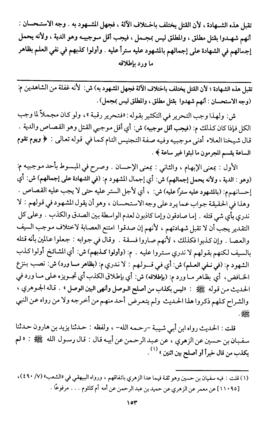 الأول: بمعنى الإبهام، والثاني: بمعنى الإحسان. وصرح في المبسوط بأحد موجبيه م: (وهو: الدية، ولأنه يحمل إجمالهم) ش: أي إجمال المشهود م: (في الشهادة على إجمالهم) ش: أي إحسانهم م: (بالمشهود عليه سترًا عليه) ش:، أي لأجل الستر عليه حتى لا يجب عليه القصاص. وهذا في الحقيقة جواب عما يرد على وجه الاستحسان، وهو أن يقول المشهود في قولهم: لا ندري بأي شيء قتله. إما صادقون وإما كاذبون لعدم الواسطة بين الصدق والكذب. وعلى كل التقدير يجب أن لا تقبل شهادتهم؛ لأنهم إن صدقوا امتنع العصابة لاختلاف موجب السيف والعصا. وإن كذبوا فكذلك، لأنهم صاروا فسقة. وقال في جوابه: جعلوا عالمين بأنه قتله بالسيف لكنهم بقولهم لا ندري ستروا عليه. م: (وأولوا كذبهم) ش: أي المشائخ أولوا كذب الشهود م: (في نفي العلم) ش: أي في قولهم: لا ندري م: (بظاهر ما ورد) ش: نصب بنزع الخافض، أي بظاهر ما ورد م: (بإطلاقه) ش: أي بإطلاق الكذب أي تجويزه على ما ورد في الحديث من قوله - صَلَّى اللَّهُ عَلَيْهِ وَسَلَّمَ -: «ليس بكذاب من أصلح الوصل وأنهى البين الوصل» ، قاله الجوهري، والشراح كلهم ذكروا هذا الحديث ولم يتعرض أحد منهم من أخرجه ولا من رواه عن النبي - صَلَّى اللَّهُ عَلَيْهِ وَسَلَّمَ -.