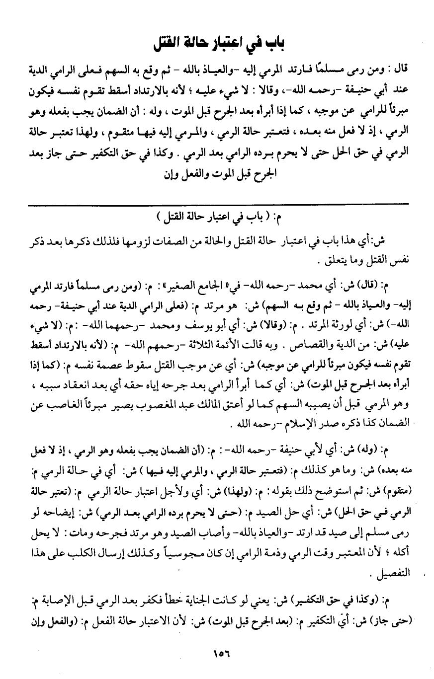 باب في اعتبار حالة القتل قال: ومن رمى مسلما فارتد المرمي إليه - والعياذ بالله - ثم وقع به السهم فعلى الرامي الدية عند أبي حنيفة - رَحِمَهُ اللَّهُ -، وقالا: لا شيء عليه؛ لأنه بالارتداد أسقط تقوم نفسه فيكون مبرئا للرامي عن موجبه، كما إذا أبرأه بعد الجرح قبل الموت، وله: أن الضمان يجب بفعله وهو الرمي، إذ لا فعل منه بعده، فتعتبر حالة الرمي، والمرمي إليه فيها متقوم، ولهذا تعتبر حالة الرمي في حق الحل حتى لا يحرم برده الرامي بعد الرمي.