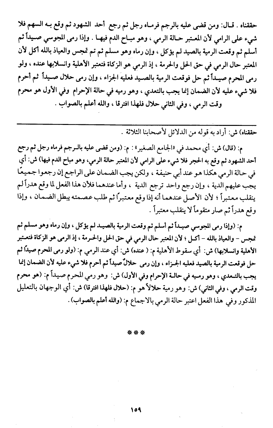 حققناه. قال: ومن قضى عليه بالرجم فرماه رجل ثم رجع أحد الشهود ثم وقع به السهم فلا شيء على الرامي لأن المعتبر حالة الرمي، وهو مباح الدم فيها. وإذا رمى المجوسي صيدا ثم أسلم ثم وقعت الرمية بالصيد لم يؤكل، وإن رماه وهو مسلم ثم تم تمجس والعياذ بالله أكل لأن المعتبر حال الرمي في حق الحل والحرمة، إذ الرمي هو الزكاة فتعتبر الأهلية وانسلابها عنده، ولو رمى المحرم صيدا ثم حل فوقعت الرمية بالصيد فعليه الجزاء، وإن رمى حلال صيدا ثم أحرم فلا شيء عليه لأن الضمان إنما يجب بالتعدي، وهو رميه في حالة الإحرام وفي الأول هو محرم وقت الرمي، وفي الثاني حلال فلهذا افترقا، والله أعلم بالصواب.