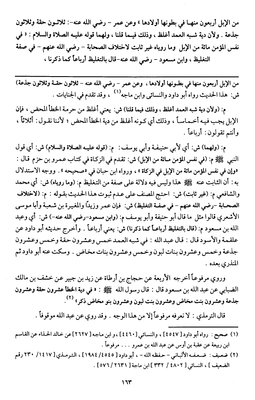وروي مرفوعا أخرجه الأربعة عن حجاج بن أرطاة عن زيد بن جبير عن خشف بن مالك الضبابي عن عبد الله بن مسعود قال: " قال رسول الله - صَلَّى اللَّهُ عَلَيْهِ وَسَلَّمَ -: «في دية الخطأ عشرون حقة وعشرون جذعة وعشرون بنت مخاض وعشرون بنت لبون وعشرون بنو مخاض ذكر» .