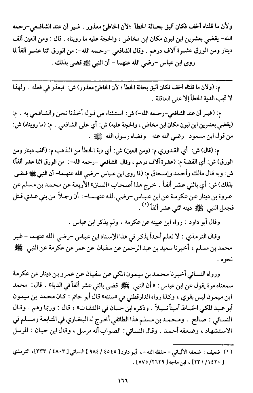 ورواه النسائي أخبرنا محمد بن ميمون المكي عن سفيان عن عمرو بن دينار عن عكرمة سمعناه مرة يقول عن ابن عباس: «أن النبي - صَلَّى اللَّهُ عَلَيْهِ وَسَلَّمَ - قضى باثني عشر ألفًا في الدية» . قال: محمد بن ميمون ليس بقوي، وكذا رواه الدارقطني في " سننه " قال أبو حاتم: كان محمد بن ميمون أبو عبد المكي الخياط أمينًا نبيلًا. وذكره ابن حبان في " الثقات "، قال: وربما وهم. وقال النسائي: صالح. ومحمد بن مسلم هذا الطائفي أخرج له البخاري في المتابعة ومسلم في الاستشهاد، وضعفه أحمد. وقال النسائي: الصواب أنه مرسل، وقال ابن حبان: المرسل