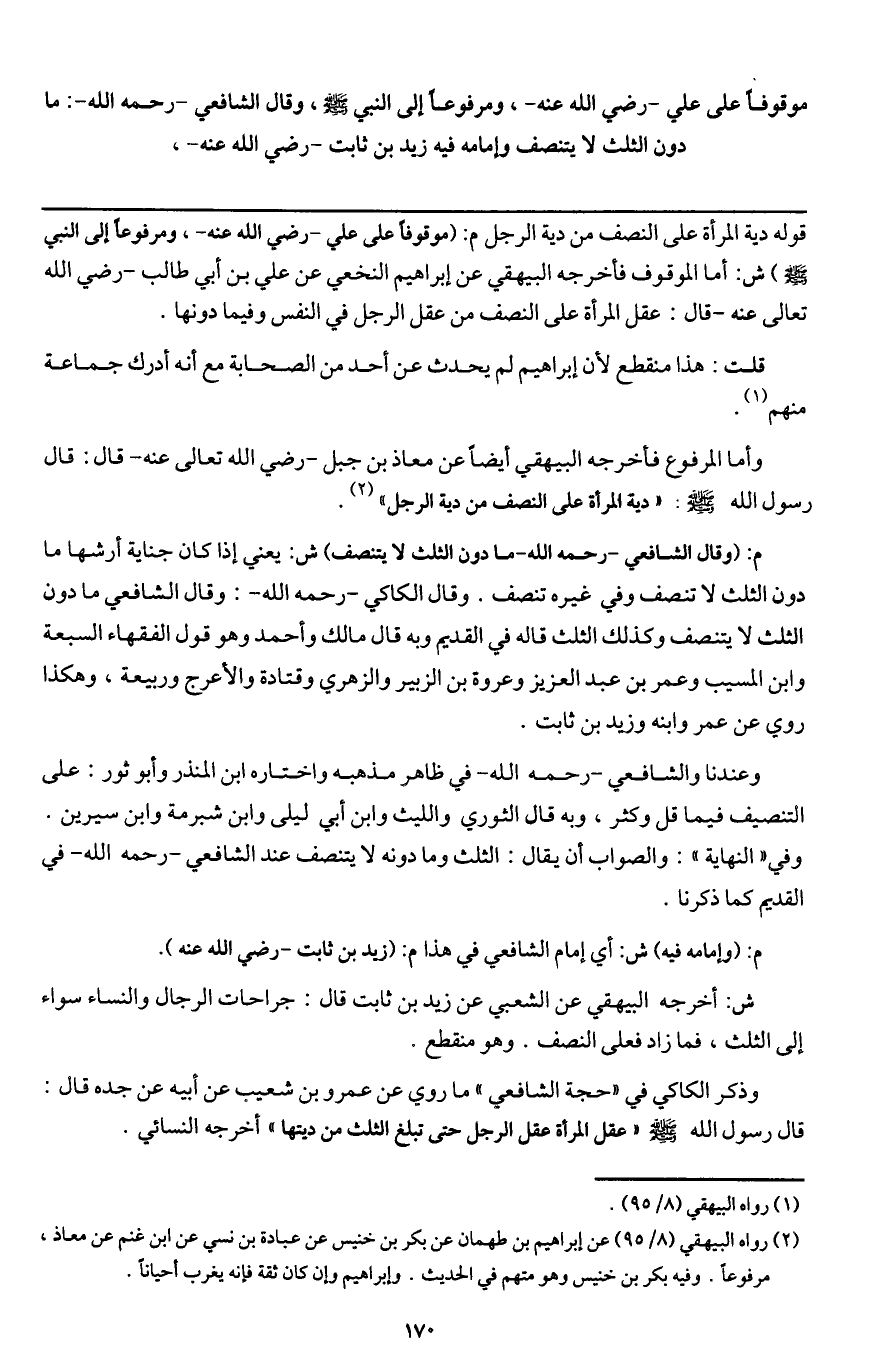 موقوفا على علي - رَضِيَ اللَّهُ عَنْهُ -، ومرفوعا - إلى النبي - صَلَّى اللَّهُ عَلَيْهِ وَسَلَّمَ -، وقال الشافعي - رَحِمَهُ اللَّهُ -: ما دون الثلث لا يتنصف وإمامه فيه زيد بن ثابت - رَضِيَ اللَّهُ عَنْهُ -.