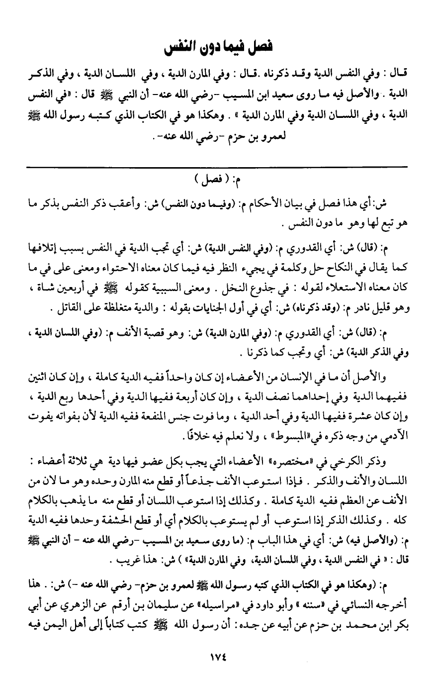 فصل فيما دون النفس قال: وفي النفس الدية وقد ذكرناه. قال: وفي المارن الدية، وفي اللسان الدية، وفي الذكر الدية. والأصل فيه ما روى سعيد بن المسيب - رَضِيَ اللَّهُ عَنْهُ - أن النبي - صَلَّى اللَّهُ عَلَيْهِ وَسَلَّمَ - قال: «في النفس الدية، وفي اللسان الدية وفي المارن الدية» . وهكذا هو في الكتاب الذي كتبه رسول الله - صَلَّى اللَّهُ عَلَيْهِ وَسَلَّمَ - لعمرو بن حزم - رَضِيَ اللَّهُ عَنْهُ -