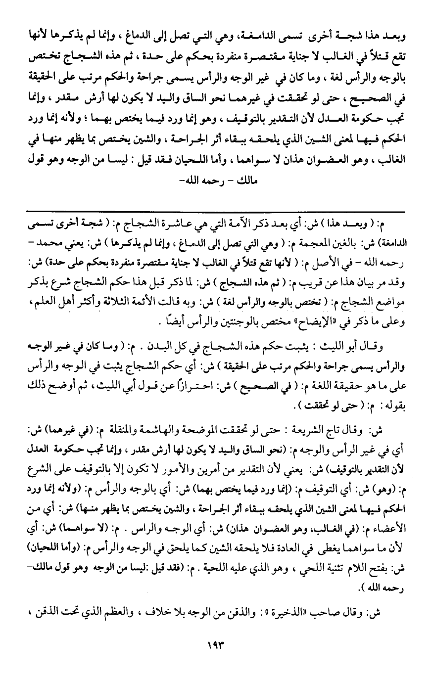 وبعد هذا شجة أخرى تسمى الدامغة، وهي التي تصل إلى الدماغ، وإنما لم يذكرها لأنها تقع قتلا في الغالب لا جناية مقتصرة منفردة بحكم على حدة، ثم هذه الشجاج تختص بالوجه والرأس لغة، وما كان في غير الوجه والرأس يسمى جراحة والحكم مرتب على الحقيقة في الصحيح، حتى لو تحققت في غيرهما نحو الساق واليد لا يكون لها أرش مقدر، وإنما تجب حكومة العدل لأن التقدير بالتوقيف، وهو إنما ورد فيما يختص بهما؛ ولأنه إنما ورد الحكم فيها لمعنى الشين الذي يلحقه ببقاء أثر الجراحة، والشين يختص بما يظهر منها في الغالب، وهو العضوان هذان لا سواهما، وأما اللحيان فقد قيل: ليسا من الوجه وهو قول مالك - رَحِمَهُ اللَّهُ -