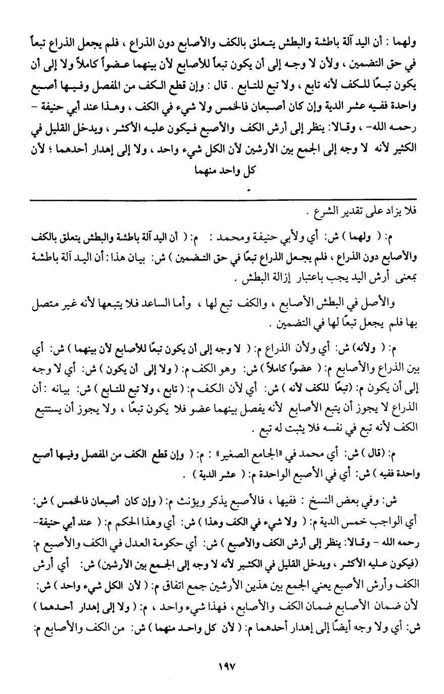 م: (ولأنه) ش: أي ولأن الذراع م: (لا وجه إلى أن يكون تبعا للأصابع لأن بينهما) ش: أي بين الذراع والأصابع م: (عضوا كاملا) ش: وهو الكف م: (ولا إلى أن يكون) ش: أي لا وجه إلى أن يكون م: (تبعا للكف لأنه) ش: أي لأن الكف م: (تابع، ولا تبع للتابع) ش: بيانه: أن الذراع لا يجوز أن يتبع الأصابع لأنه يفصل بينهما عضو فلا يكون تبعا، ولا يجوز أن يستتبع الكف لأنه تبع في نفسه فلا يثبت له تبع. م: (قال) ش: أي محمد في " الجامع الصغير ": م: (وإن قطع الكف من المفصل وفيها أصبع واحدة ففيه) ش: أي في الأصبع الواحدة م: (عشر الدية) .