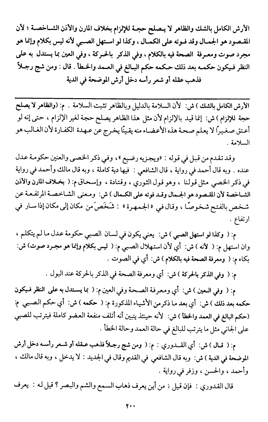 الأرش الكامل بالشك والظاهر لا يصلح حجة للإلزام بخلاف المارن والأذن الشاخصة؛ لأن المقصود هو الجمال وقد فوته على الكمال، وكذا لو استهل الصبي لأنه ليس بكلام وإنما هو مجرد صوت ومعرفة الصحة فيه بالكلام، وفي الذكر بالحركة، وفي العين بما يستدل به على النظر فيكون حكمه بعد ذلك حكمه حكم البالغ في العمد والخطأ.